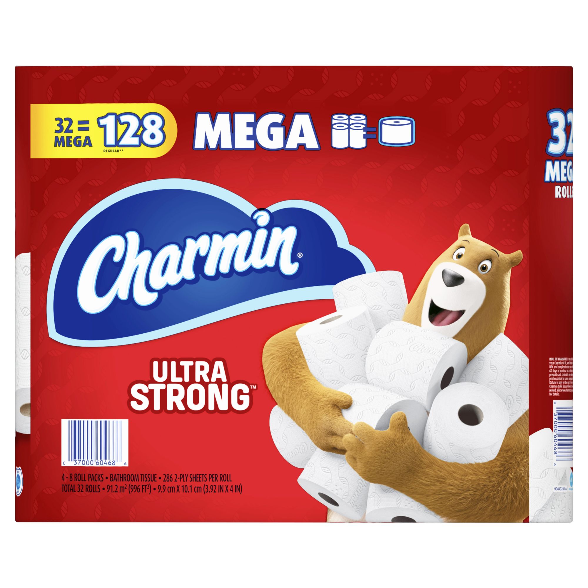 Pack contains 32 rolls 286 sheets per roll of charmin ultra strong toilet paper.